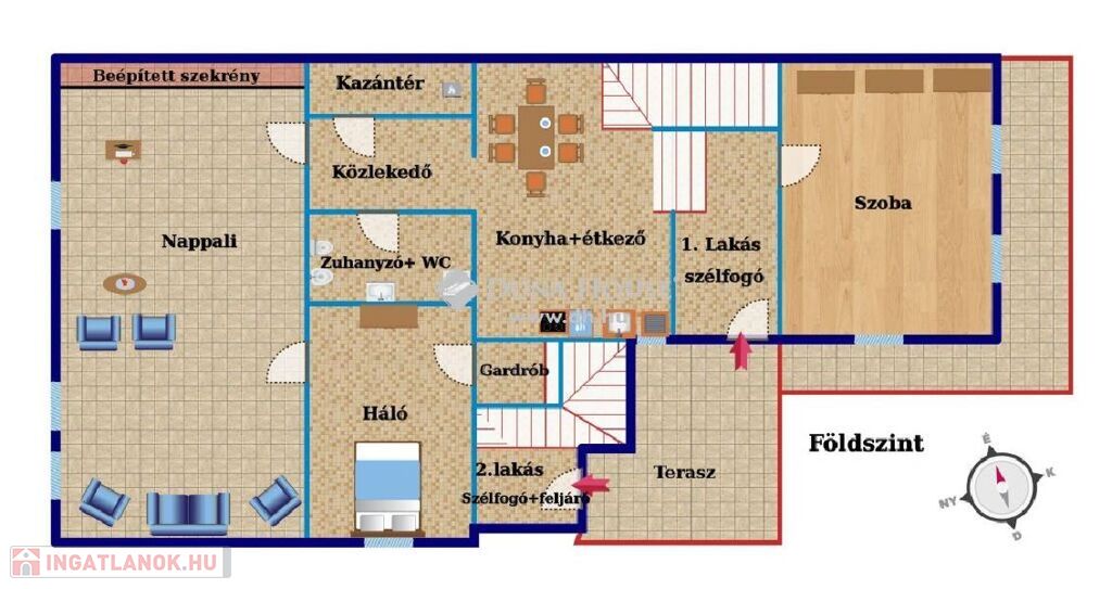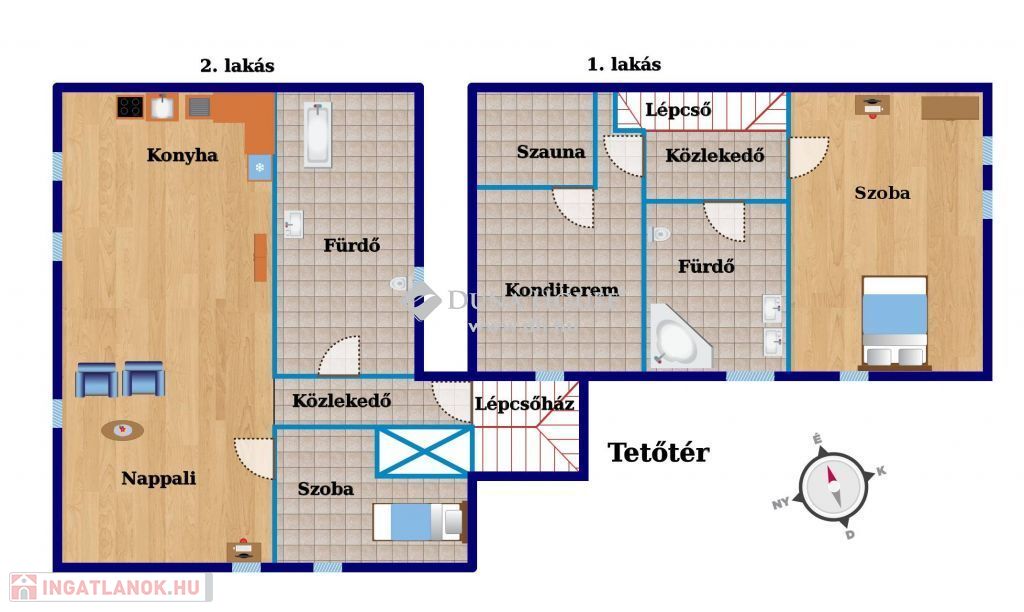 A 2. lakás tágas konyha - nappalival, fürdőszobával és szobával rendelkezik. A 684 m2-es telek hátsó részén a tűztorony és a vár felé is panorámás, bensőséges, padokkal, grillezővel, fatározóval felszerelt belső udvar került kialakításra, mely ugyanakkor nagyobb létszámú társaság fogadására is alkalmas.
