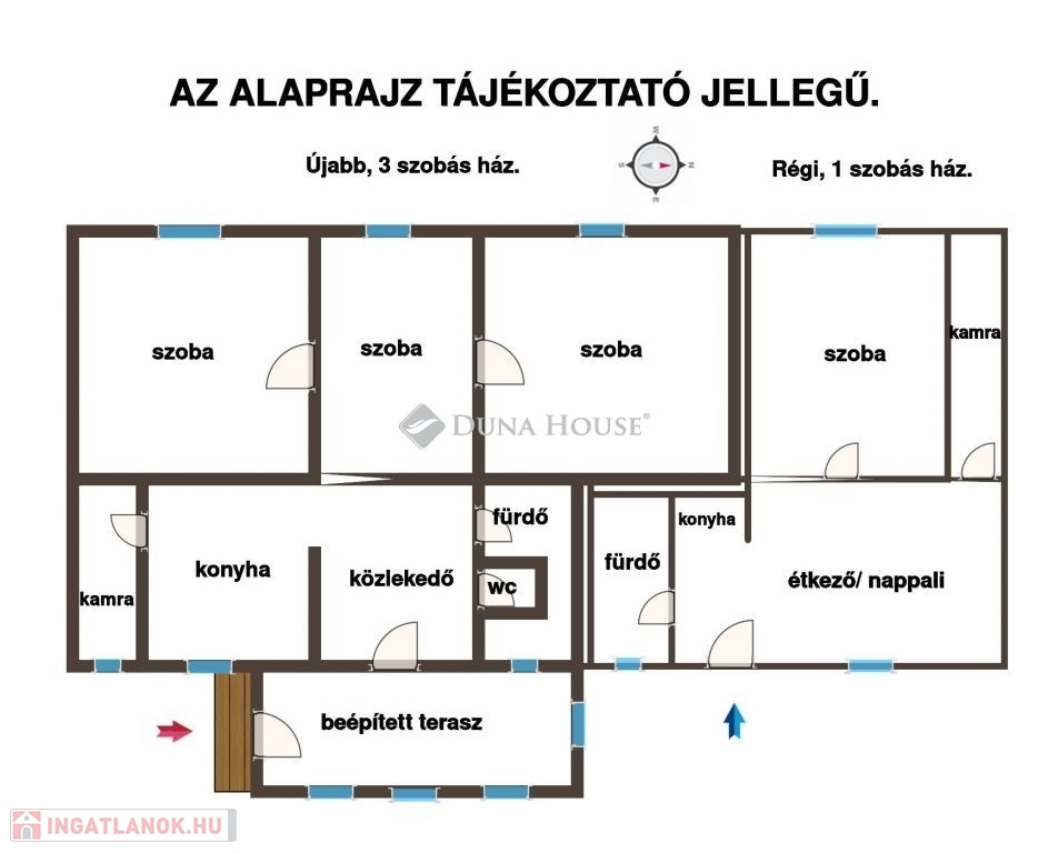 Az ingatlan két külön bejáratú házból áll: egy 37 nm-es, felújítandó, öreg, 1 szobás, vegyes falazatú épületből és egy 1987-ben épült, jó állapotban lévő, 83 nm-es, 3 szobás házból, ami tégla szerkezetű, így biztosítva a tartósságot és a jó hőszigetelést.