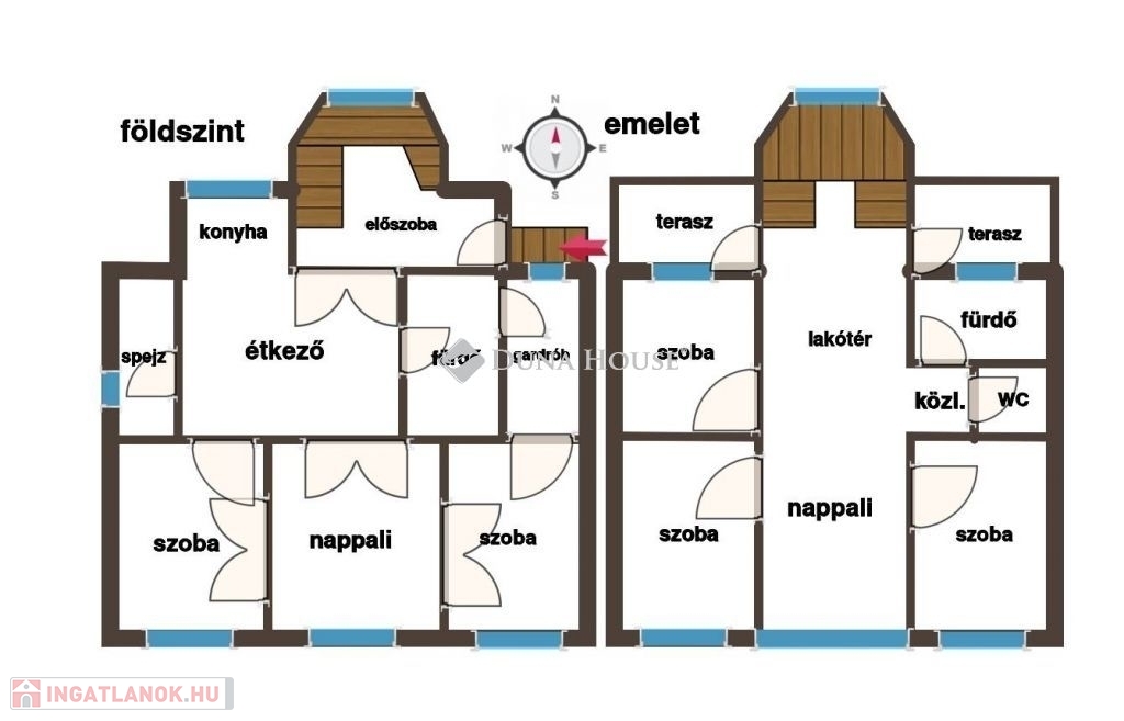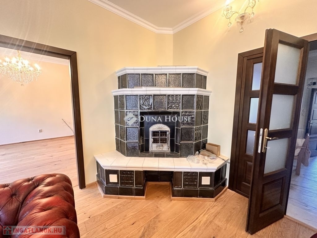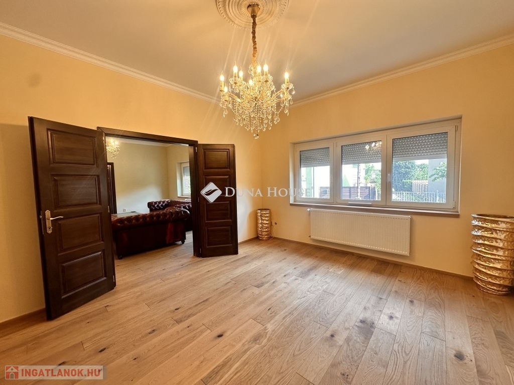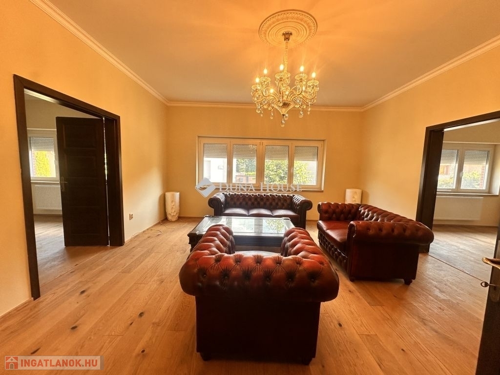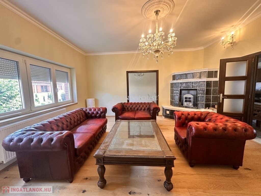 Földszinten: egy tágas és igazán ízlésesen berendezett gyönyörű cserépkályhával ellátott nappali, három egymásból nyíló szoba, ami külön-külön is megközelíthető, konyha ami kapcsolatban áll az étkezővel, a fürdőszoba, melyből az egyik közvetlenül a gardrób mellett áll, különálló WC, optimális méretű spejz, és egy hatalmas, világos előszoba, a gyönyörű fából készült lépcsőházzal.