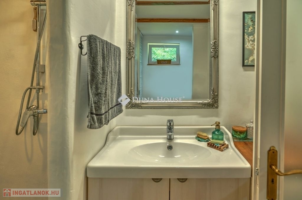a fürdő, mely tadelakt technikával, stílusba illeszkedően készült, beépített bútorokkal és háztartási