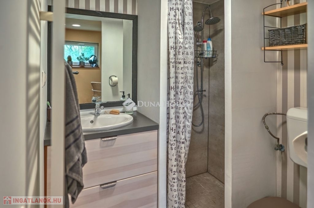 szekrénnyel. A fürdő közvetlenül a hálóból is megközelíthető. A nappali és a ház többi helyiségének