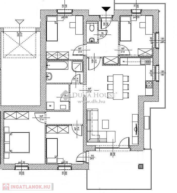 A ház teljes külső és belső falazata XELLA rendszerből épül, a külső falvastagság 45 cm!! YTONG Lambda tégla a falazat hőtechnikai tényezője megfelel a 15 cm-es hőszigeteléssel épülő tégla lakóházaknak, viszont ezesetben nem kerül a falazatra külön külső hőszigetelés, így az épület légtechnikája jobb, természetesebb. (Igény esetén a ház hagyományos módon, tégla + hőszigeteléssel is készülhet.) A födém LEIER vasbeton födém lesz, belül a teljes lakórészben gipszkarton álmennyezettel. A lakóházak 22 fokos hajlásszögű nyeregtetők, Terrán Zenit cserépfedéssel. A külső nyílászárók 3 rétegű hőszigetelő üvegezésű nyílászárók.