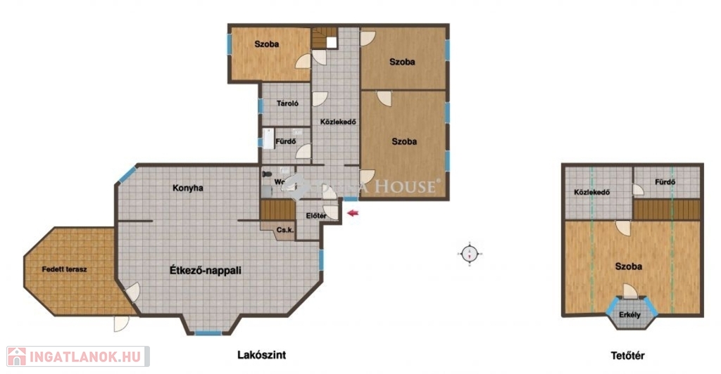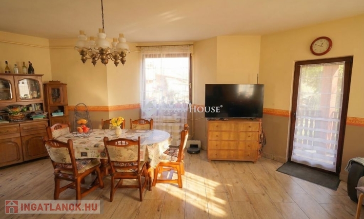 Az ingatlan a jelenlegi formáját 1996-ben nyerte el akkor lett hozzáépítéssel és a tetőtér beépítéssel bővítve az épület, mely egy része alatt pince is van. A ház lakóterébe egy szélfogón keresztül jutunk be, amiből jobbra lévő előszobából nyílik a 3 szoba, zuhanyzós fürdő és a külön wc. A bejárattól balra egy közel 40 nm-es amerikai konyhás nappaliba jutunk, ami tágas teret biztosít a család számára a közös időtöltésre, jó idő esetén pedig a nappaliból nyíló fedett terasz is rendelkezésre áll. A tetőtérben egy erkélyes szoba, és fürdőszoba található. A ház sokféle lehetőséget rejt magában, amit a leendő tulajdonos igényei szerint alakíthat, és akár több generáció számára ideális otthont biztosít. Igény esetén a földszinten még egy különbejáratú szoba kialakítható a 22,5 m²-es szoba kettéosztásával.