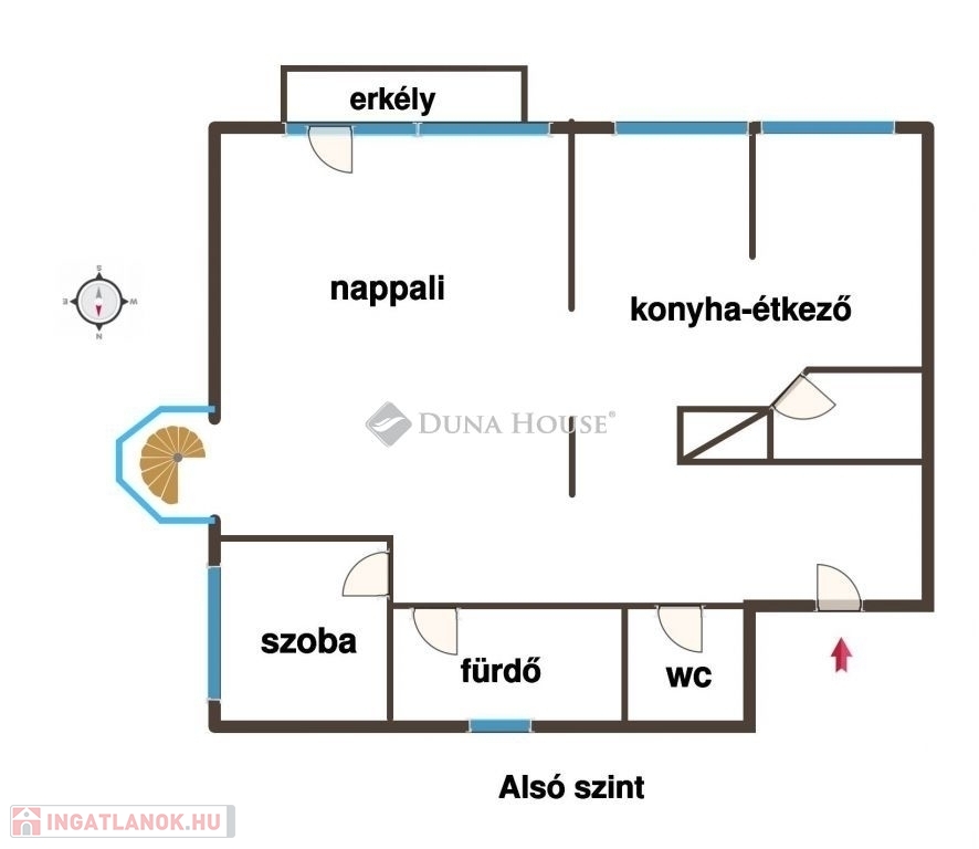 Az alsó szint:-előszoba beépített szekrényekkel-vendég wc-fürdőszoba-tágas konyha-étkező-kényelmes nappali cserépkályhával-kamra-szoba-erkély